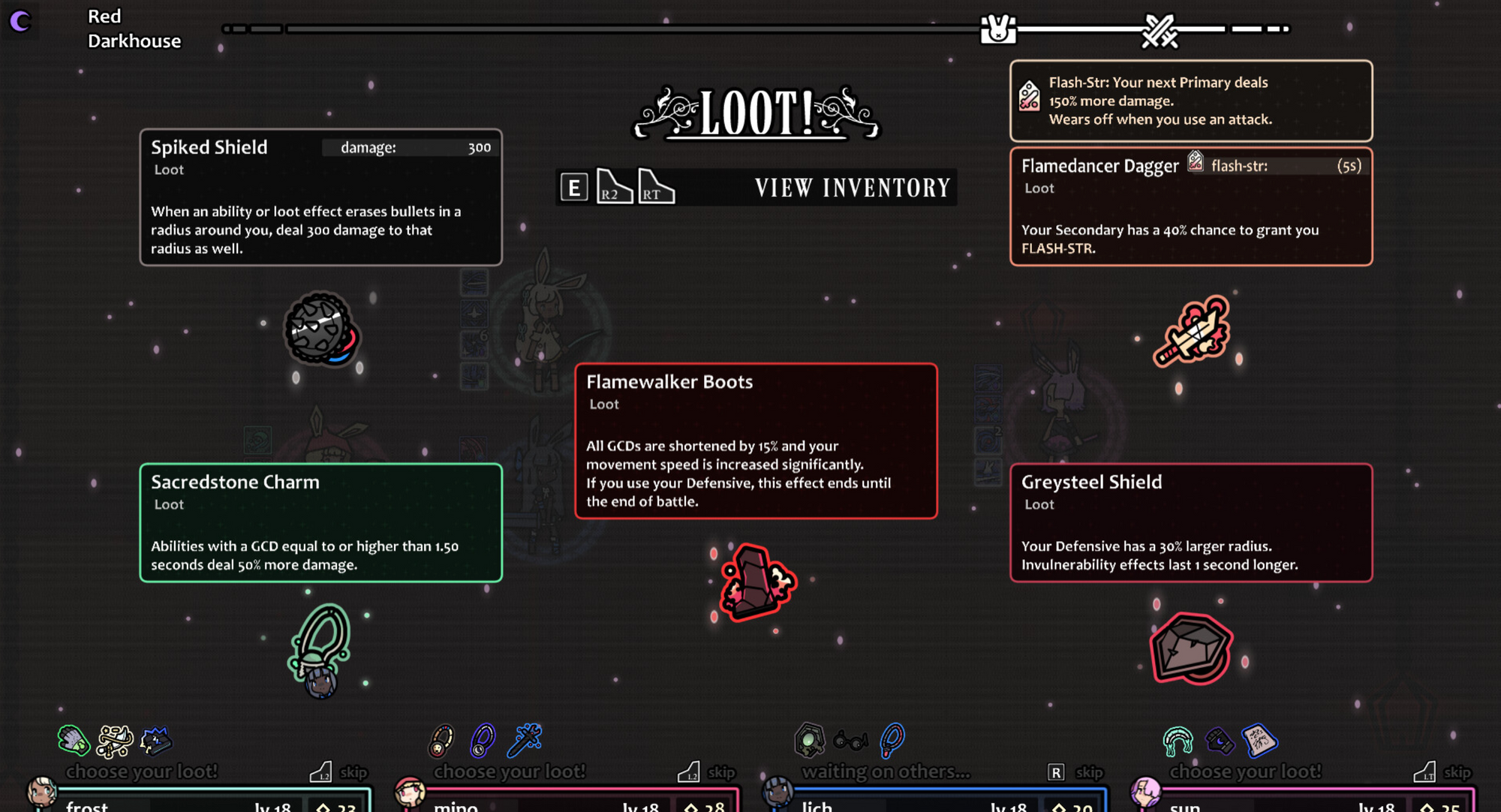 At the end of each boss, you get a chance to take some loot that will improve your character. But other players might want the same stuff than you, so pick wisely!